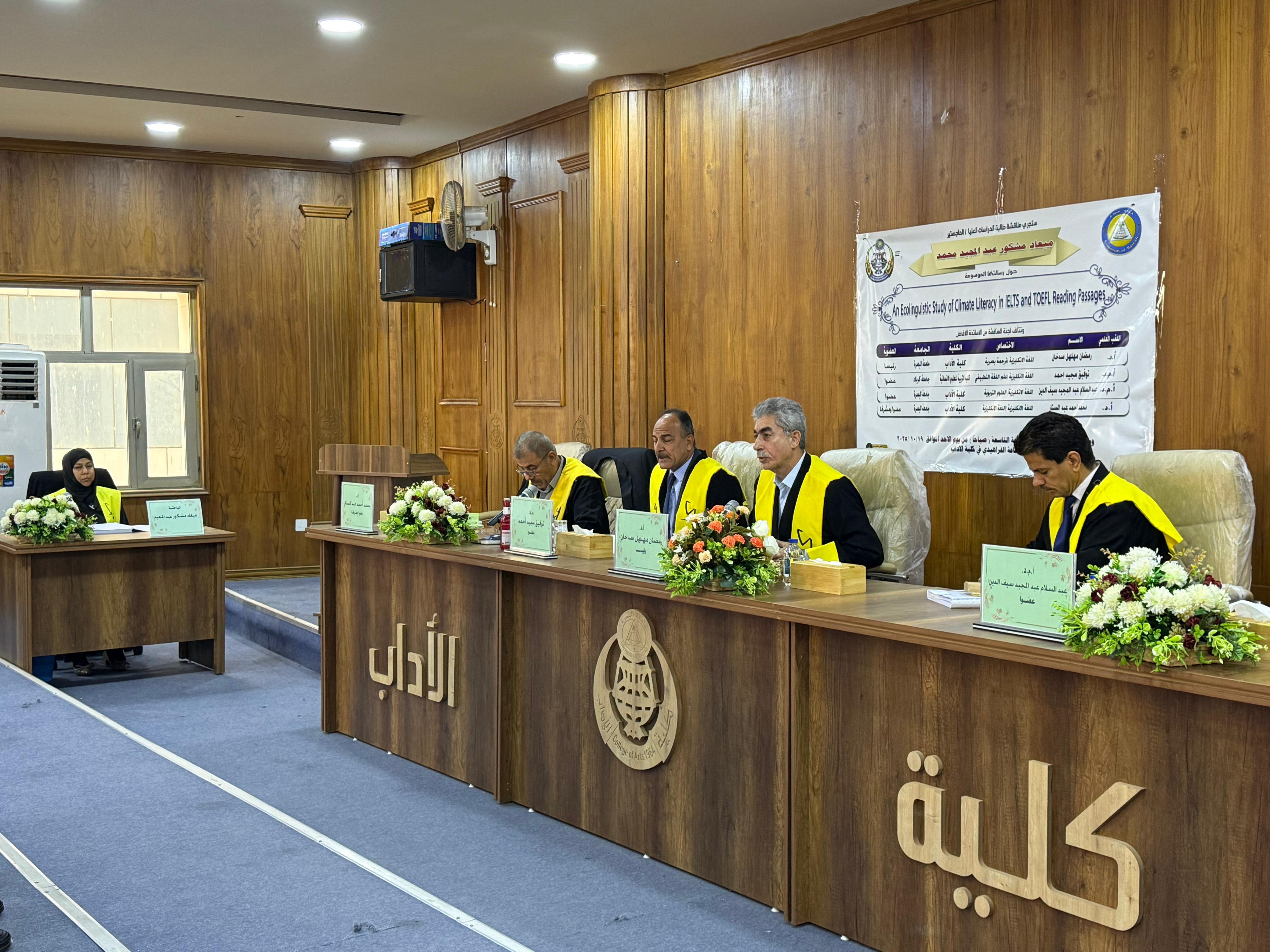 بحثت رسالة الماجستير في قسم اللغة الانجليزية في كلية الآداب بجامعة البصرة الثقافة المناخية في النصوص القرائية لأمتحانات الايلتس والتويفل.