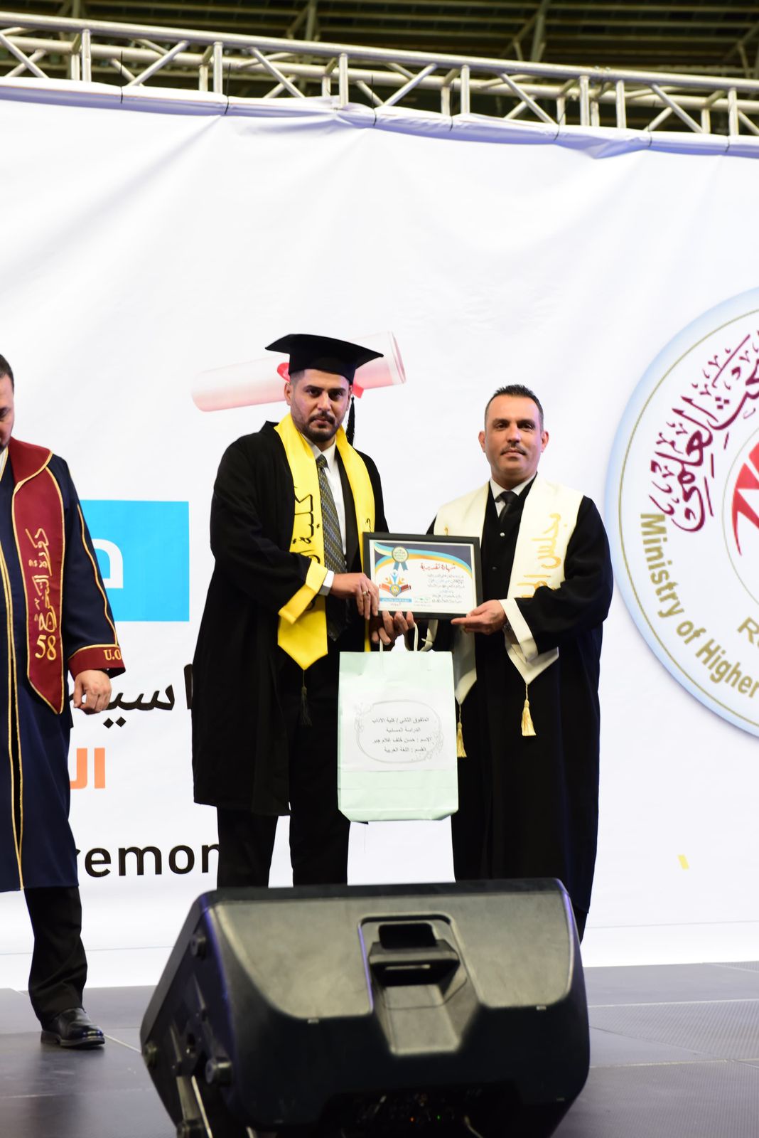 وشارك في الحفل السيد عميد كلية الآداب الأستاذ الدكتور ماجد عبد الحميد الكعبي، ومعاون العميد للشؤون العلمية الأستاذ الدكتور حيدر عبد الرضا التميمي، ومعاون العميد للشؤون الإدارية الأستاذ الدكتور محمد عبد كاظم ، الذين قدّموا التهاني للخريجين متمنين لهم مستقبلًا زاهرًا مليئًا بالنجاح.