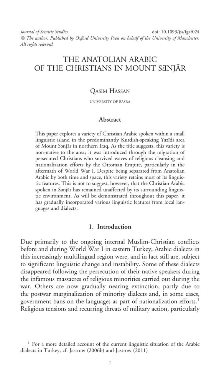 صدر للأستاذ المساعد الدكتور قاسم فليح حسن العكيلي بحثا بعنوان «العربية الأناضولية لدى المسيحيين في جبل سنجار The Anatolian Arabic of the Christians in Mount Sǝnjār» في "Journal of Semitic Studies" الصادرة عن جامعة أكسفورد، وهي مجلة مفهرسة ضمن الربع الأول (Q1) في قواعد بيانات كلاريفيت وسكوبوس. ويُقدم الباحث وصفًا لسانيًا مقارنًا للغات المسيحيين الناجين من المذابح العثمانية في مناطق جنوب شرق تركيا إبّان الحرب العالمية الأولى. وبعد البحث النظري والتحليل العملي للتسجيلات الصوتية لمتحدثين أصليين، خرج الباحث إلى أنّ المسيحيين في تلك المناطق قد احتفظوا بمعظم السمات اللسانية التي حملوها معهم إلى جبل سنجار من موطنهم الأصلي في ماردين وما جاورها من القرى والمدن الواقعة في الجانب التركي.