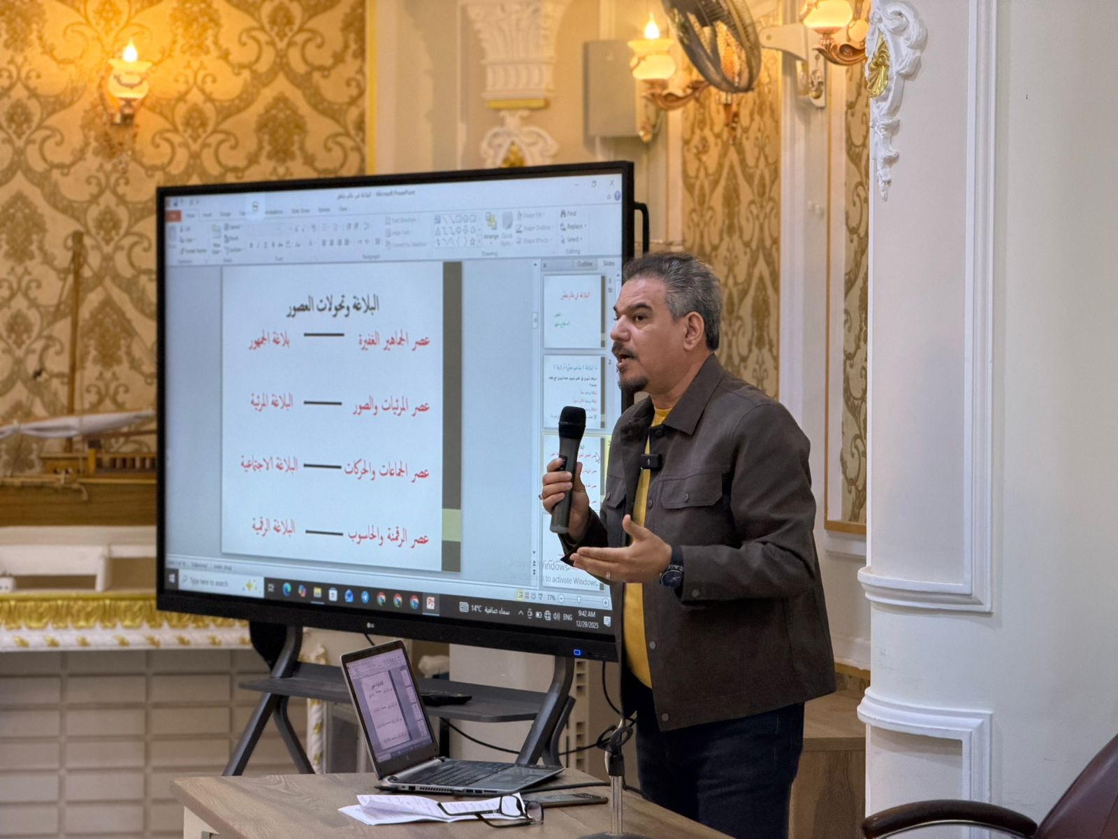 أقام الأستاذ الدكتور صلاح حسن حاوي التدريسي في كلية الآداب/ قسم اللغة العربية حلقة نقاشية بعنوان (البلاغة في عالم متغير)، تناول فيها التحولات المعاصرة وأثرها في إعادة صياغة المفهوم البلاغي ووظائفه.