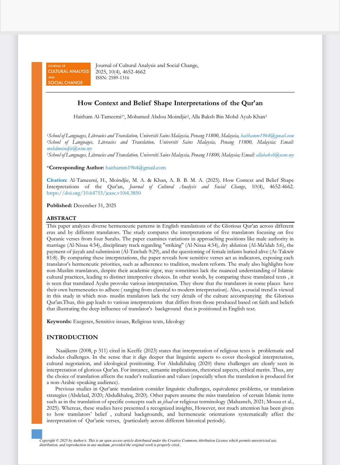 في إطار دعم البحث العلمي وتعزيز النشر في المجلات العالمية الرصينة، نُشر البحث العلمي الموسوم:“How Context and Belief Shape Interpretation of the Quran”