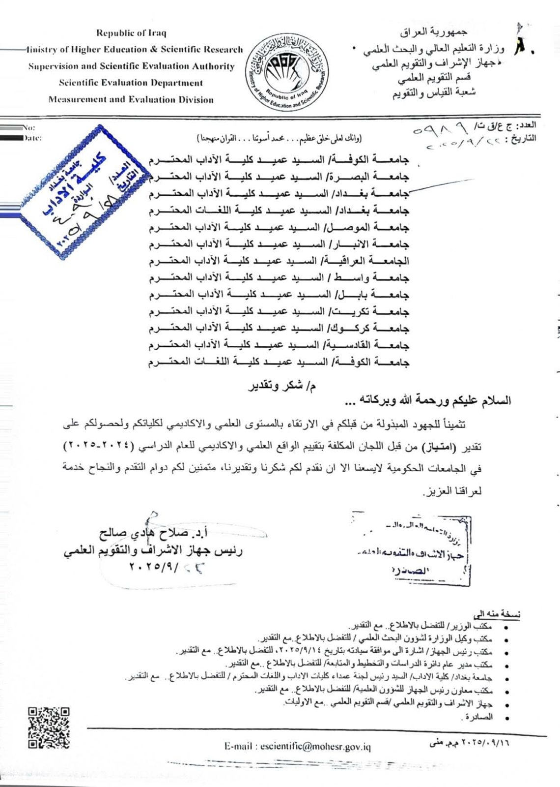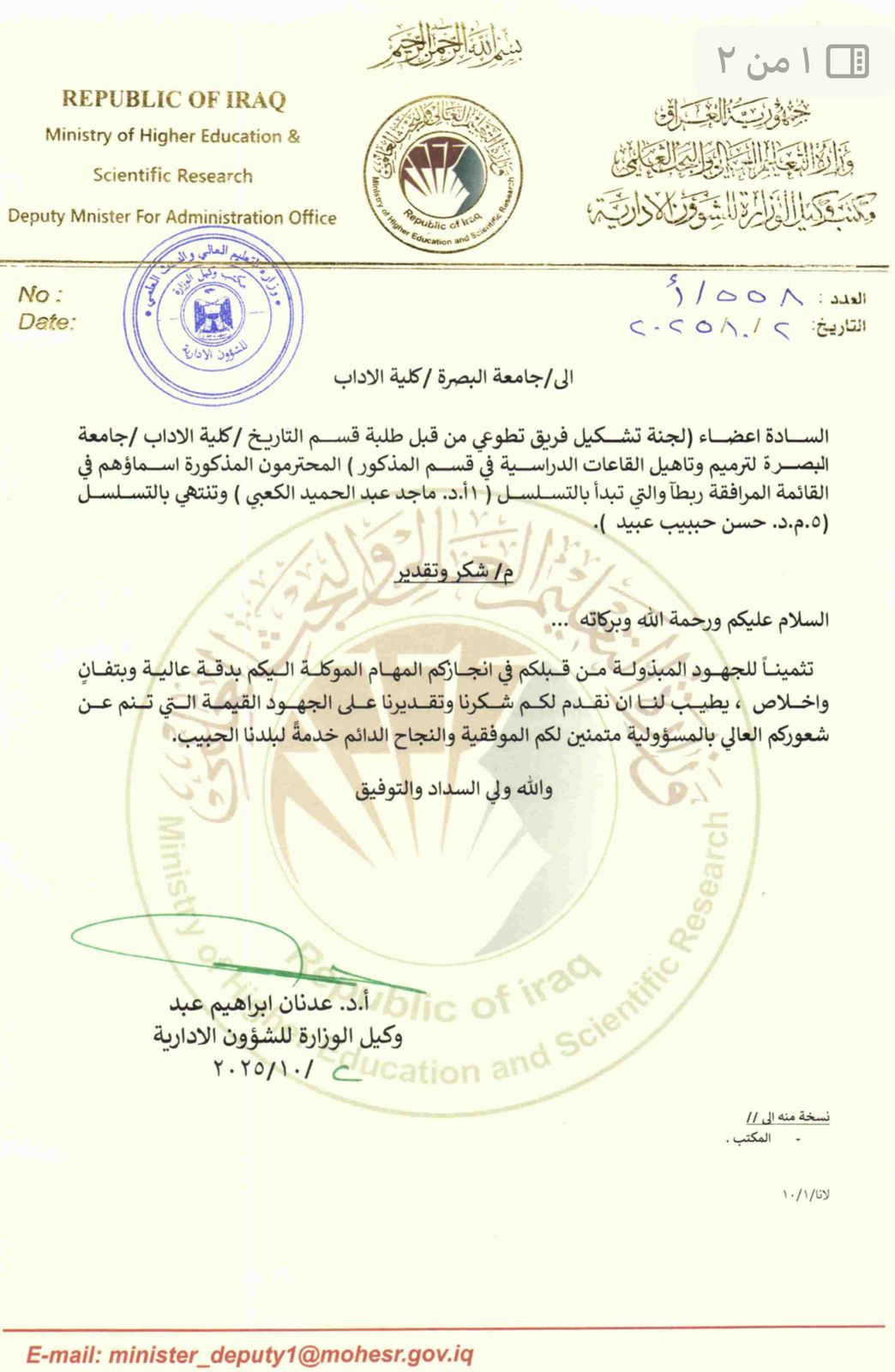 منح السيد الأستاذ الدكتور عدنان إبراهيم عبد، وكيل وزير التعليم العالي والبحث العلمي للشؤون الإدارية، كتاب شكر وتقدير إلى السيد عميد كلية الآداب الأستاذ الدكتور ماجد عبد الحميد الكعبي والسيد معاون العميد للشؤون العلمية والدراسات العليا الأستاذ الدكتور حيدر عبد الرضا التميمي، والسادة أعضاء لجنة الفريق التطوعي والسادة (رئيس قسم التاريخ ا م د علاء حسن ومقرريه الدكتور حسن حبيب والدكتور محمد علي و طلبة قسم التاريخ). وذلك تثميناً لجهودهم المبذولة في ترميم وتأهيل القاعات الدراسية في القسم.
