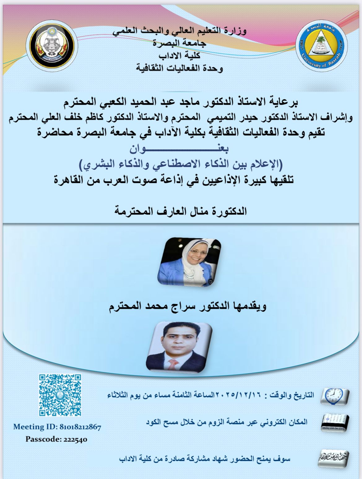 السيدات والسادة الأفاضل تشرفنا دعوتكم لحضور المحاضرة التي تقيمها وحدة الفعاليات الثقافية بكلية الآداب في جامعة البصرة والموسومة "الإعلام بين الذكاء الاصطناعي والذكاء البشري" التي ستبقيها كبيرة الاذاعيبن في إذاعة صوت العرب من القاهرة الدكتورة منال العارف ويقدمها الدكتور سراج محمد في الساعة الثامنة من مساء يوم الثلاثاء الموافق ٢٠٢٥/١٢/١٦ على منصة زووم وبحسب الرابط المرافق وسيجري توزيع شهادات تقديرية للحضور الكريم