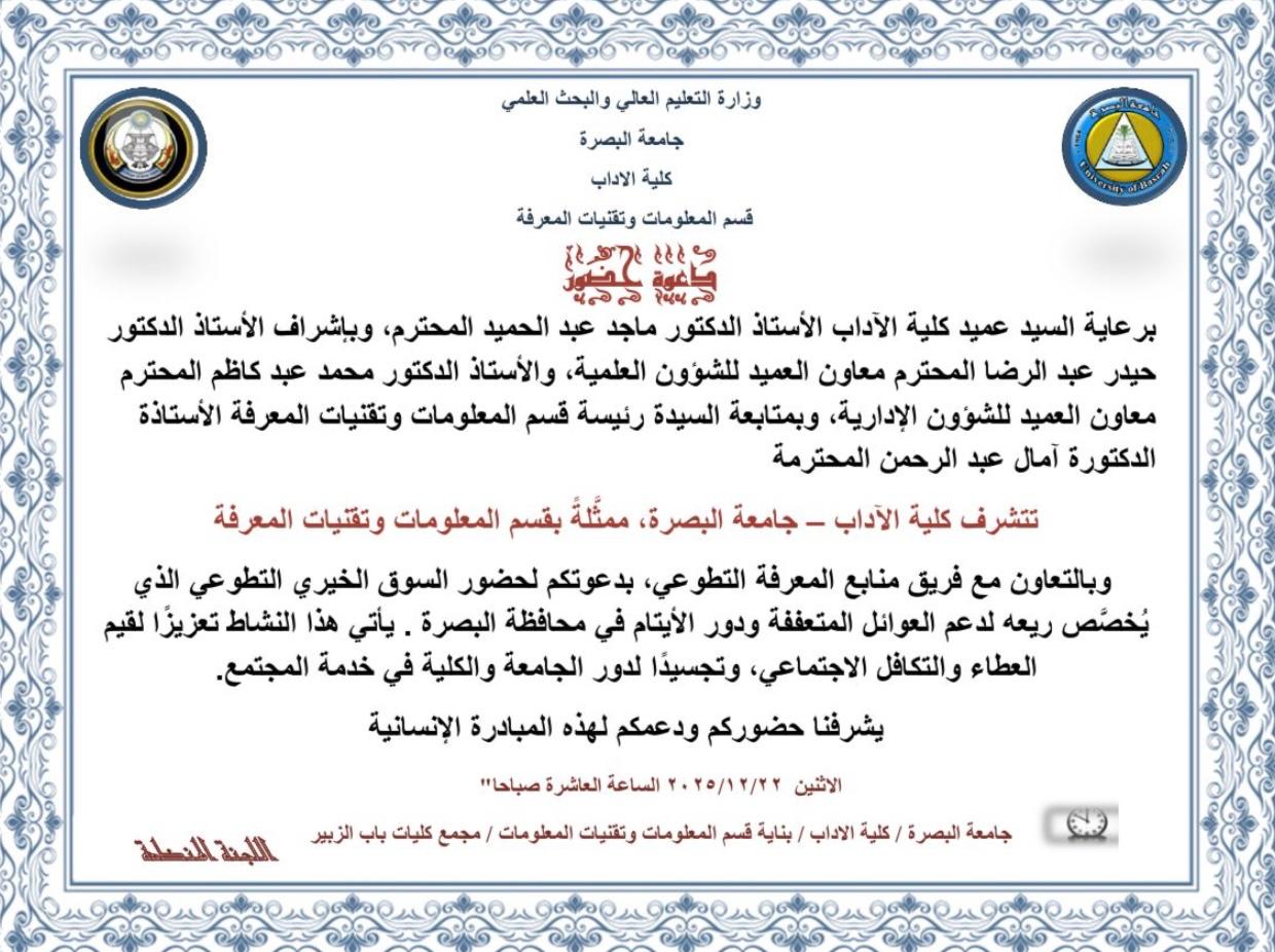 سيقيم قسم المعلومات وتقنيات المعرفة في كلية الآداب بجامعة البصرة يومي الاثنين والثلاثاء الموافقين 22–23 /12 /2025 سوقًا خيريًا تطوعيًا، يُخصَّص ريعه لدعم المتعففين ودور الأيتام في محافظة البصرة.